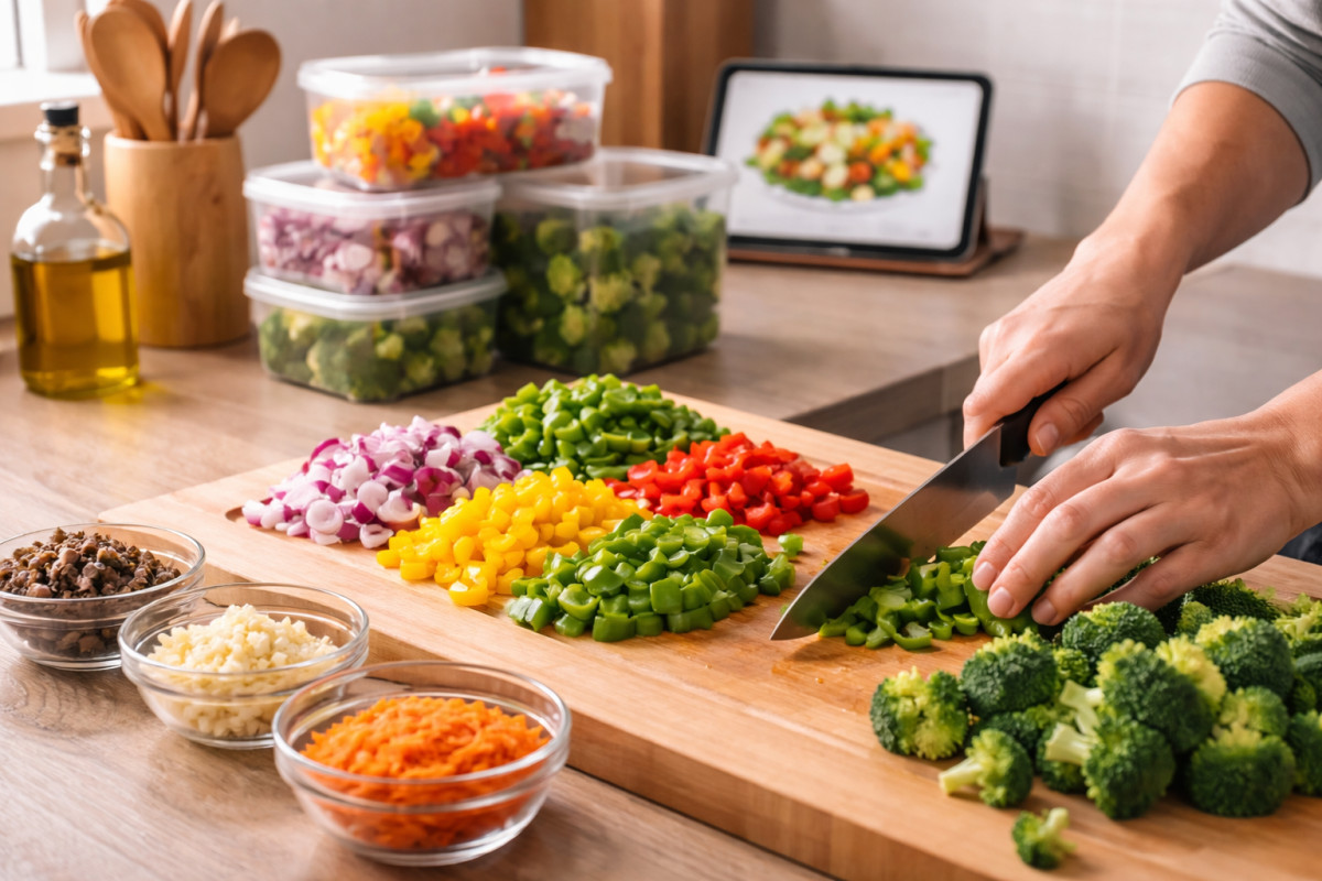 Ένας από τους πιο αποτελεσματικούς τρόπους για να γλιτώσεις χρόνο είναι να προετοιμάζεις ορισμένα υλικά από πριν. Μπορείς, για παράδειγμα, να πλύνεις και να κόψεις λαχανικά που θα χρησιμοποιήσεις τις επόμενες ημέρες ή να έχεις έτοιμες μερίδες στο ψυγείο.