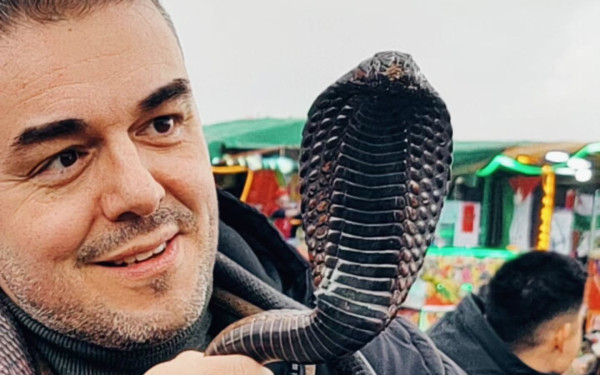 Ίσως γι' αυτό και είχε το θάρρος όχι μόνο να πλησιάσει την κόμπρα -βρίθει ο τόπος από φίδια στις αγορές- που χρησιμοποιούνται για να μαγεύουν τους τουρίστες, αλλά και να την πιάσει να τη...φορέσει γύρω από το κεφάλι του σε απόσταση αναπνοής από το πρόσωπό του....
