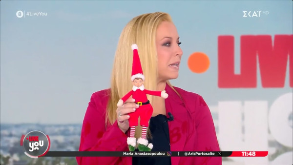 Καλό μήνα και καλή εβδομάδα ευχήθηκαν η Μαρία Αναστασοπούλου και ο Άρης Πορτοσάλτε στο Live You της Δευτέρας με τον δεύτερο να δίνει στη συμπαρουσιάστριά του για δώρο μια φιγούρα από το χριστουγεννιάτικο ντεκόρ του πλατό τους.